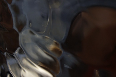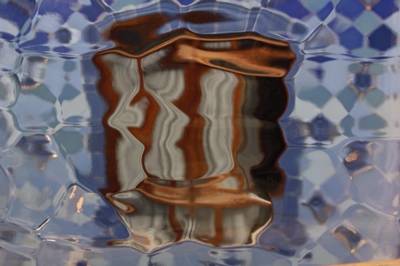 The interior courtyard is tiled with various shades of blue (darker to lighter to mimic descending and ascending ocean depths) and the stair and landing railing is iron and glass. The glass itself is not flat but is textured to heighten the interior “underwater” effect. None of these pictures has been altered, they’ve just been taken through the glass.